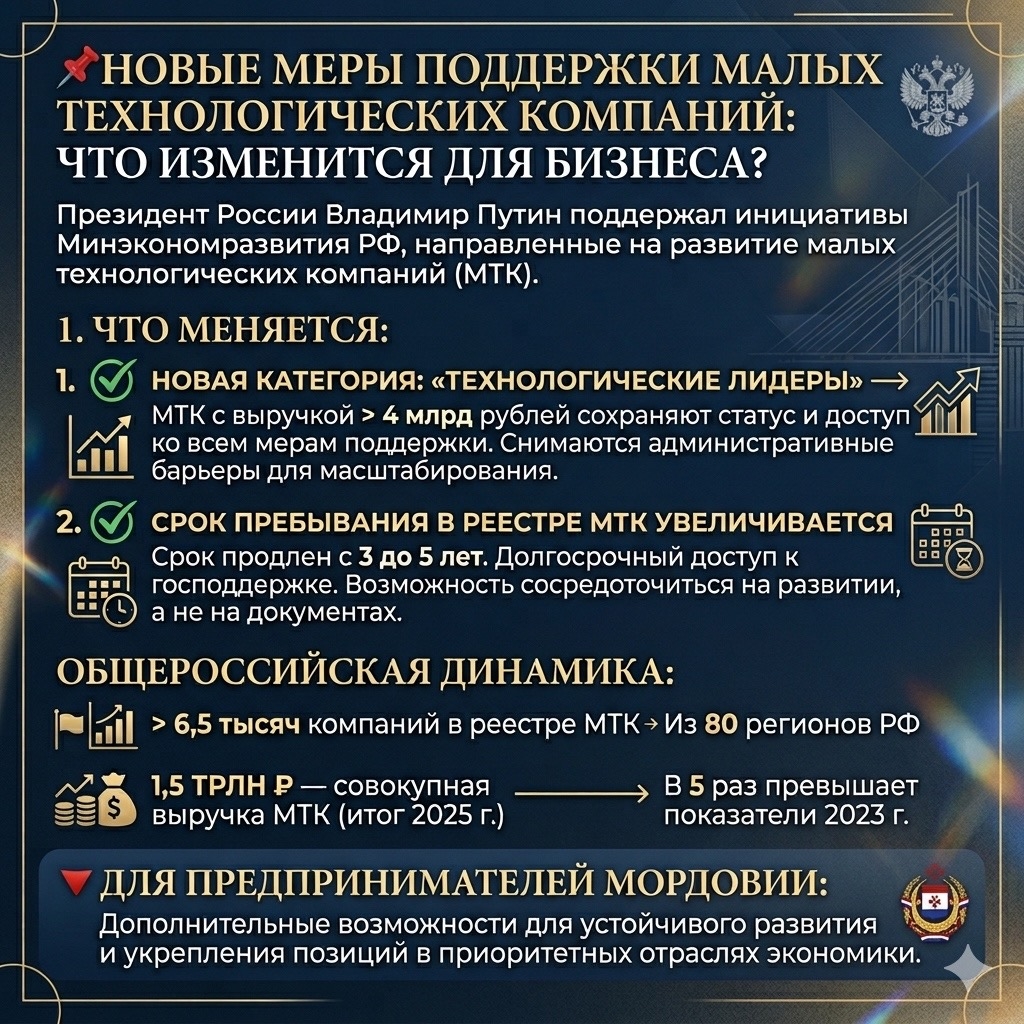 Срок пребывания в реестре МТК увеличивается с 3 до 5 лет. Это даст бизнесу возможность сосредоточиться на развитии, а не на переоформлении документов, и обеспечит долгосрочный доступ к государственной поддержке.